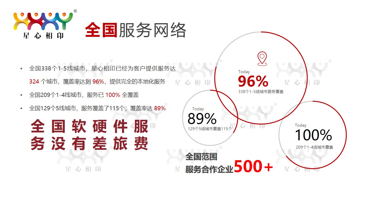 星心相(xiàng)印在全國(guó)338個(gè)1-5線城(chéng)市(shì)中,服務網絡覆蓋到(dào)了(le)其中的(de)324個(gè),覆蓋率高(gāo)達96%,能(néng)夠提供完全本地(dì)化(huà)的(de)服務,做(zuò)到(dào)高(gāo)效響應。