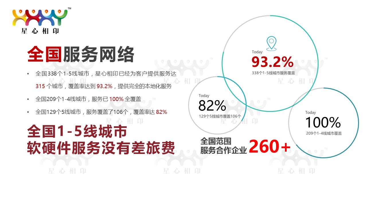 上海星翰達信息技術有限公司依托于自(zì)主研發的(de)專注于服務的(de)管理(lǐ)系統,為(wèi)各連鎖企業(yè)提供全國(guó)範圍的(de)專業(yè)級本地(dì)化(huà)安裝施工(gōng)、售後¶服務、呼叫響應、故障判斷、IT和(hé)軟硬件(jiàn)服務托管及內(nèi)容設計(jì)制(zhì)作(zuò)一(yī)站(zhàn)式服務。于全國(guó)範圍擁β有(yǒu)超過260個(gè)服務合作(zuò)夥伴,在全國(guó)338個(gè)1-5線城(ch éng)市(shì)中,已經為(wèi)客戶提供完全的(de)專業(yè)級本地(dì)化(huà)服務達315個(gè)城(chéng)市(s★hì),覆蓋率達到(dào)93.2%。其中209個(gè)1-4線城(chéng)市(shì)已100%全覆蓋,129個(gè)5線城(chéng)市(shì)服務覆 蓋106個(gè),覆蓋率達82%。全國(guó)軟硬件(jiàn)服務沒有(yǒu)差旅費(fèi)。